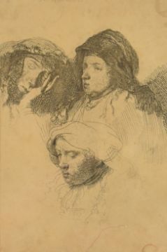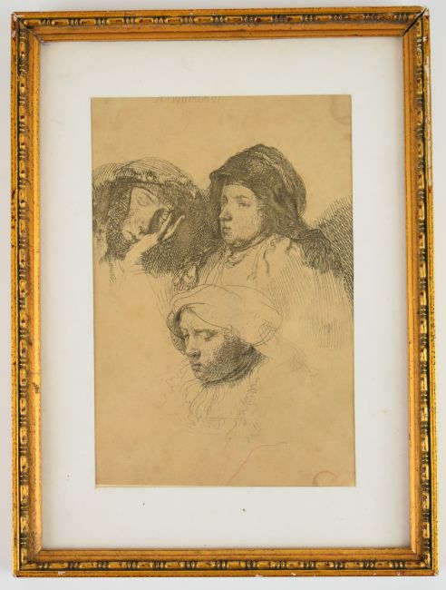 Rembrandt van Rijn (1606-1669) etching three heads of women: one asleep., likely third version, 13 x 9.5cm, in gilt frame