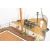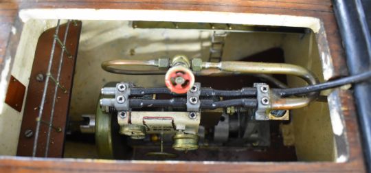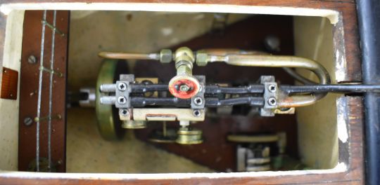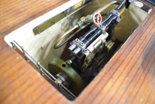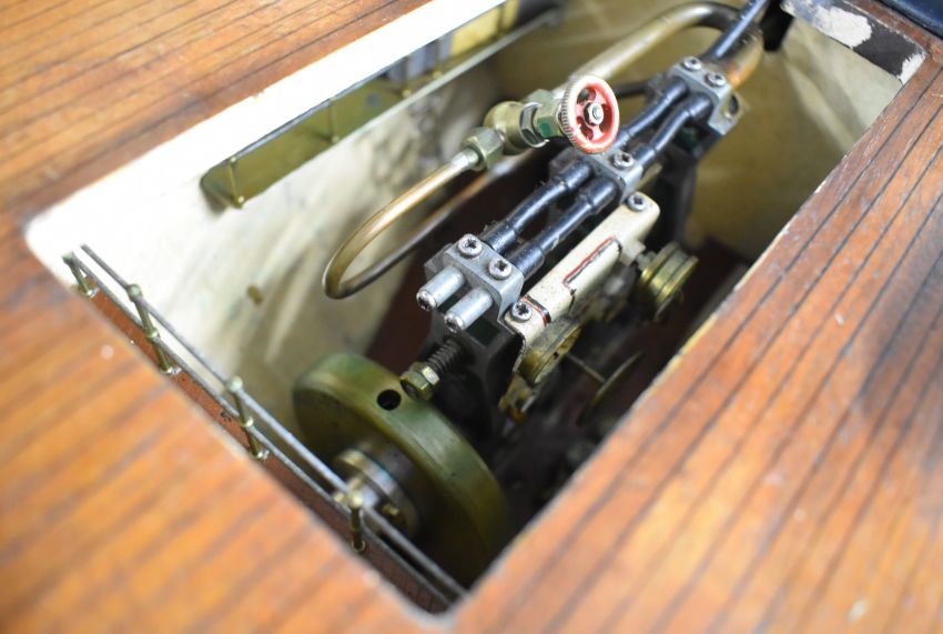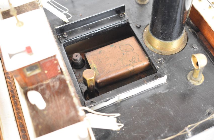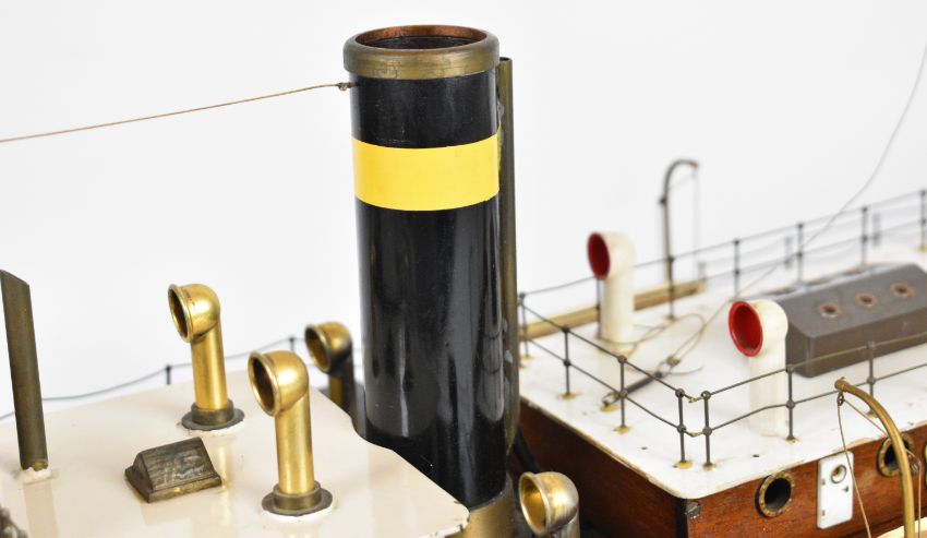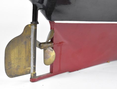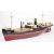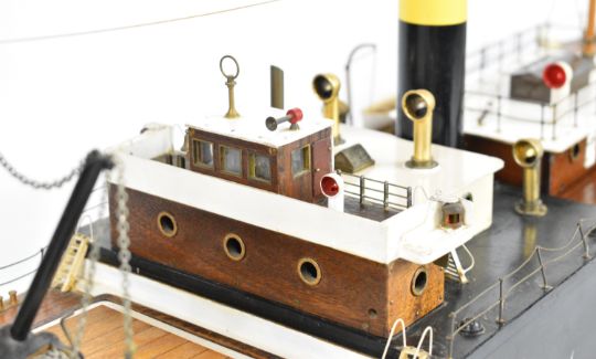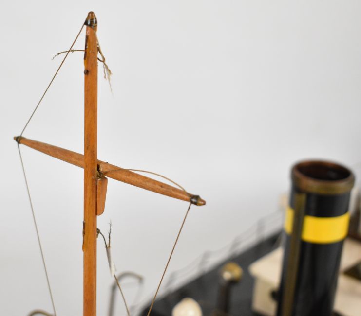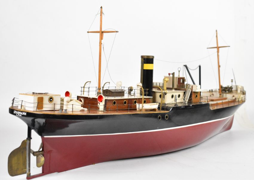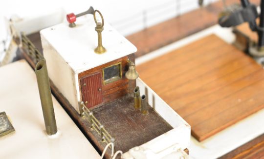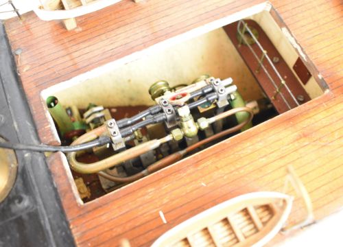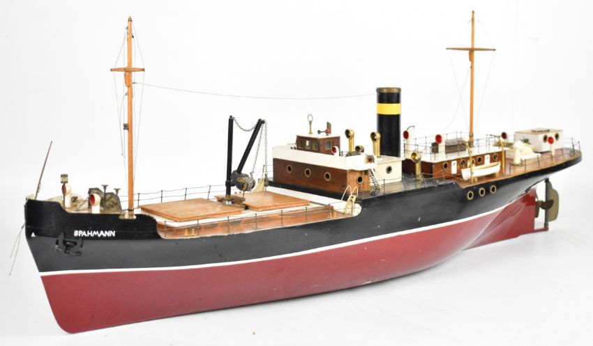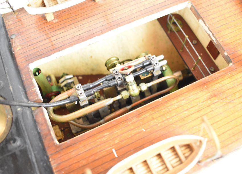 Live steam model cargo ship with fibreglass hull and metal and wooden superstructure and detailing. The copper boiler feeding a three cylinder oscillating engine, the engine room having detailing such as walkways, control panel with false pressure gauges and dummy generating set. Overall length 100cm
