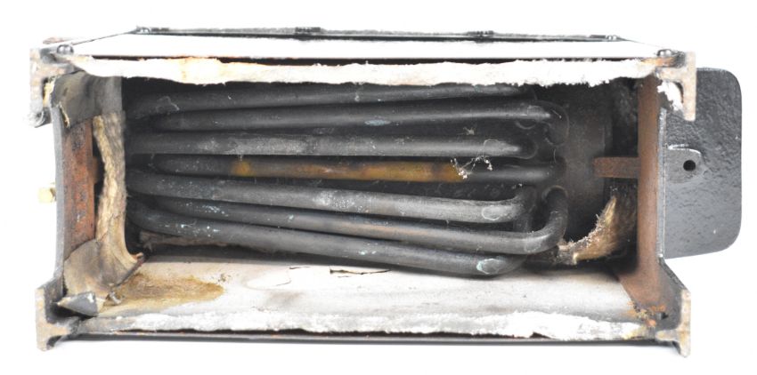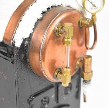 Stuart 504 live steam boiler, the copper barrel having water level gauge glass, 0-100 psi pressure gauge, safety valve, steam take off valve and water clack, overall length 36cm