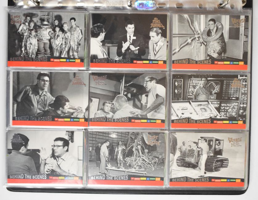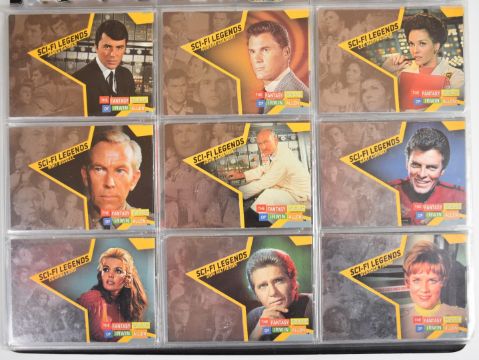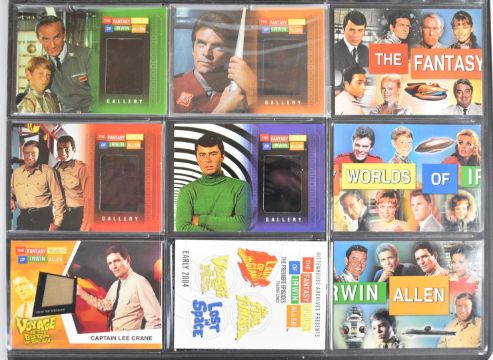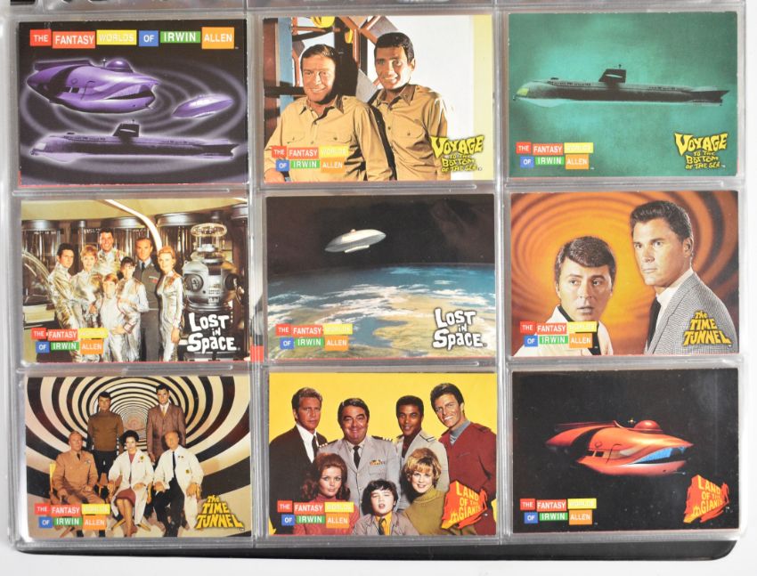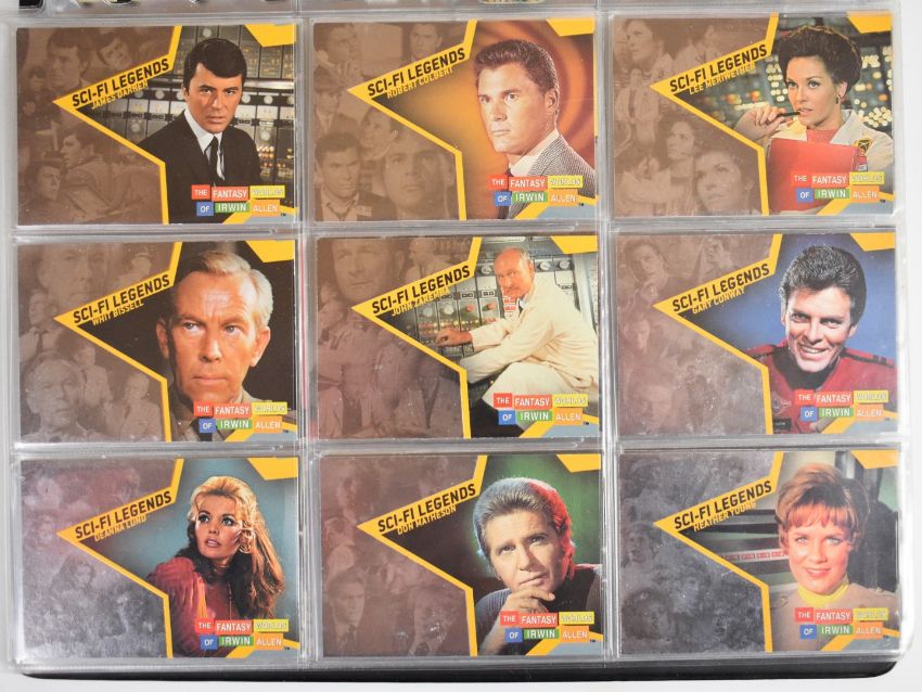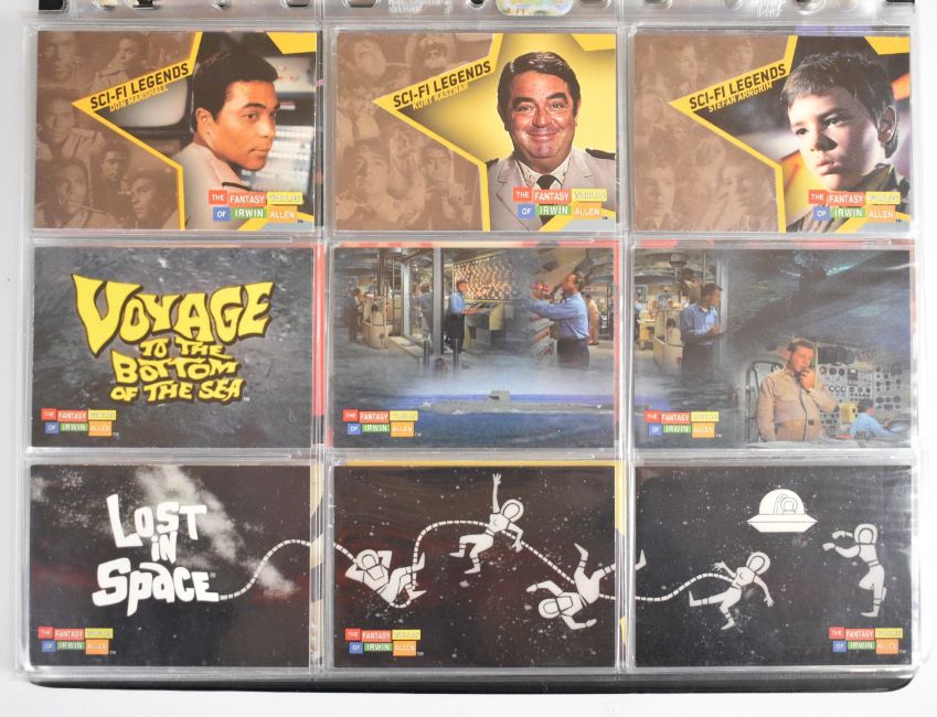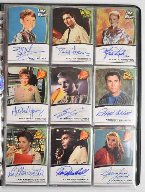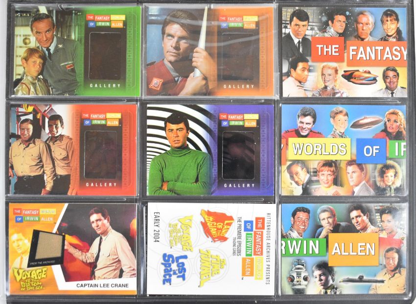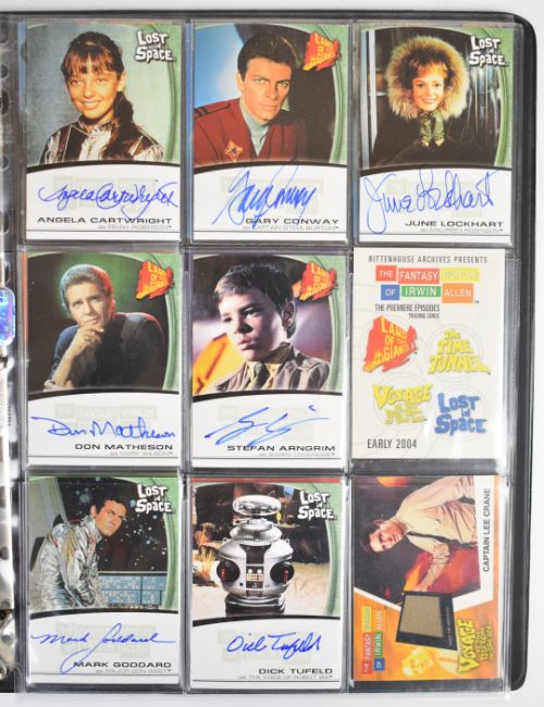 The Fantasy Worlds of Irwin Allen trading cards featuring Land of the Giants, Lost in Space Time, Tunnel and Voyage to the Bottom of the Sea comprising complete base set, bonus sets and twenty chase cards including gallery stills, costume material and signatures for Angela Cartwright, Bill Mumy, David Hedison, Marta Kristen, Gary Conway, Mark Goddard, Robert Colbert, June Lockhart, Don Matheson, Stefan Arngrim, Dick Tufeld, Lee Meriwether, Don Marshall, Deanna Lund and Heather Young, housed in an official binder, total card count 172