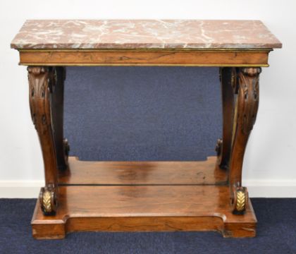 Regency rosewood and marble topped breakfront console table with acanthus decorated scrolling supports, mirror back and undershelf, W105 x D39 x H90cm