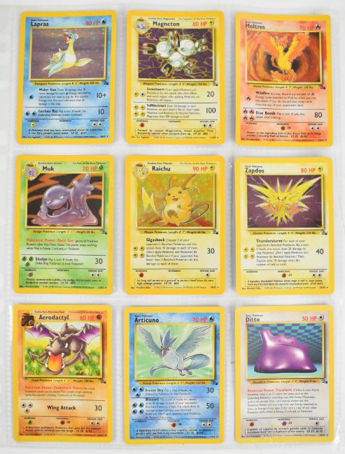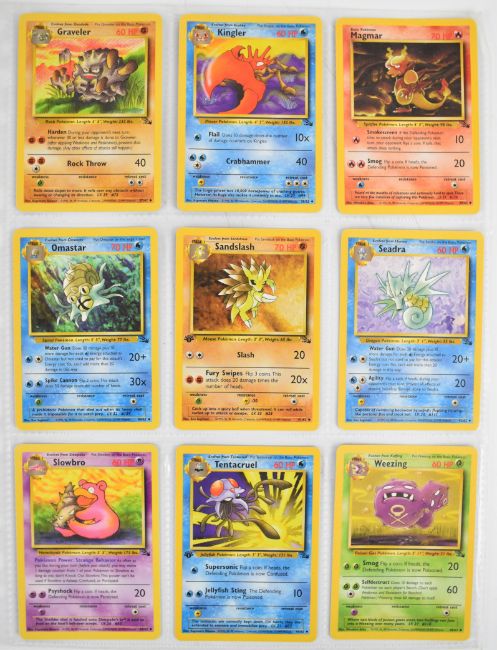 Pokémon TCG - Complete Fossil set by Wizards of the Coast, 1999, comprising all 62 cards including 15 holos with Kabutops 9/62 first edition.