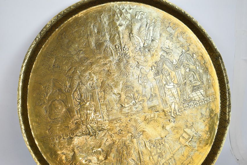 Large treen, probably elm platter, copper pan and a brass Indian / Persian table top, largest diameter 65cm