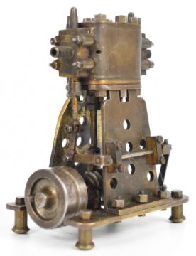 Small twin cylinder live steam marine or similar engine with radial valve gear, driving a 2.5cm flywheel, overall length 7.5cm