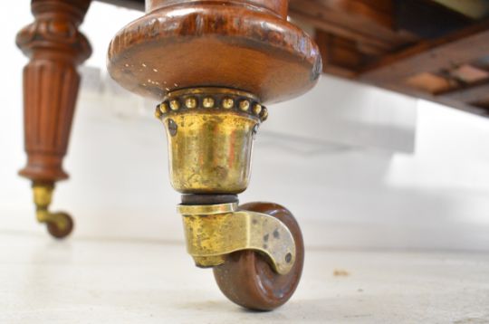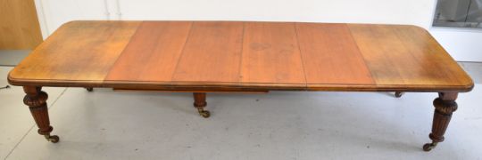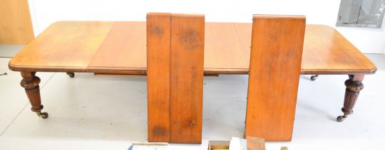Victorian oak wind out extending dining table with five legs and seven extra leaves and brass castors, L min 155 max 455 x W122 x H73cm