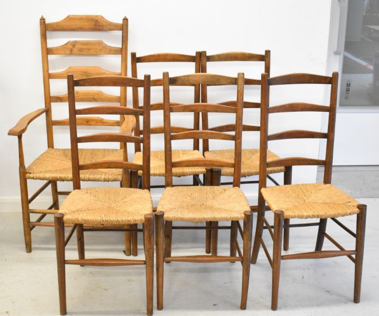 Set of six (5+1) Arts & Crafts oak rush seated dining chairs