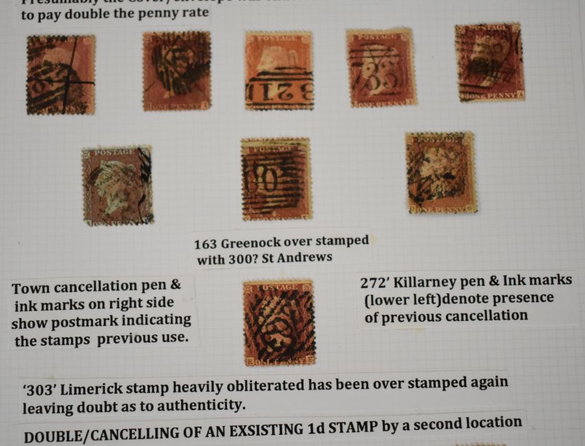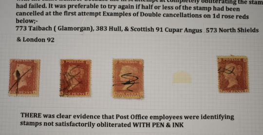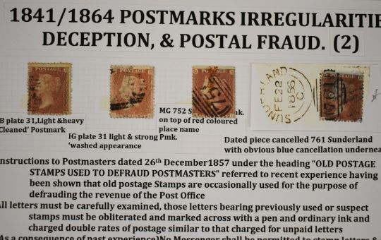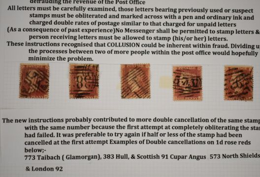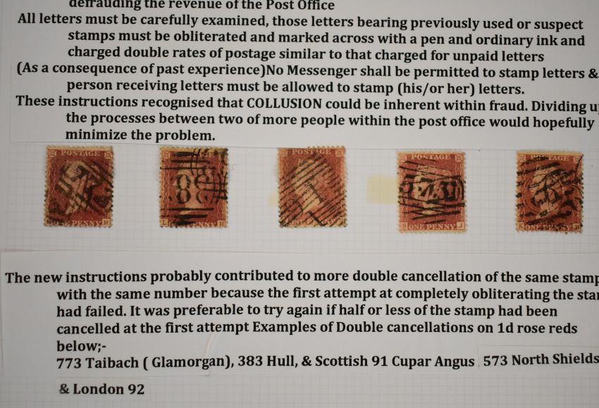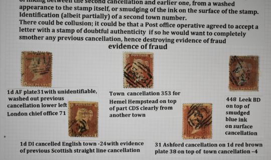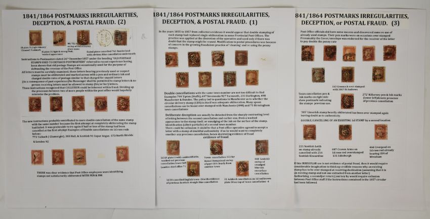 Queen Victoria postal fraud and deception, well written collection of three pages of 1d reds with examples of fraud and deception