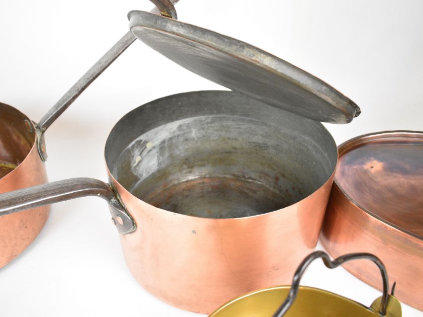 Three 19thC copper saucepans, two with lids, together with a brass jam pan, largest diameter 35cm