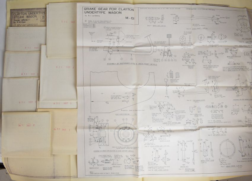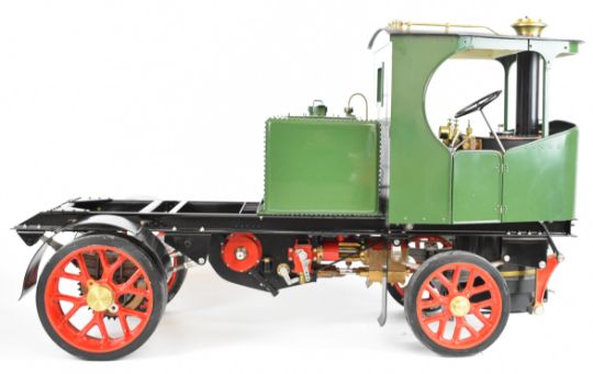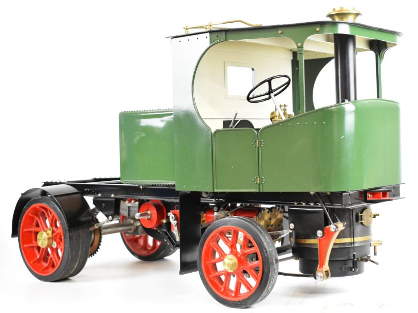 Part built exhibition standard 2 inch scale Clayton steam wagon. The coal fired silver soldered copper boiler with water level gauge glass, twin safety valves piped to an outlet beside the chimney and 0-150psi pressure gauge. The boiler was informally hydraulically tested at the vendor's local club but no paperwork was issued. The boiler is fed with an engine driven feed pump via an exhaust heater or economiser and injector beside the driver (some pipework remains to be finished). The twin cylinder engine having reversing quadrant in the cab, driving the rear wheels via a chain to the differential (chain and small sprocket included but not fitted), with castings and drawings to add brakes to the Bernard Lundberg design. The wagon riding on spoked wheels shod with solid rubber tyres, both axles having leaf springs. With drawings and some Bernard Lundberg articles, and lengths of channel to suit the building of a trailer. Overall length of tractor unit only 79cm