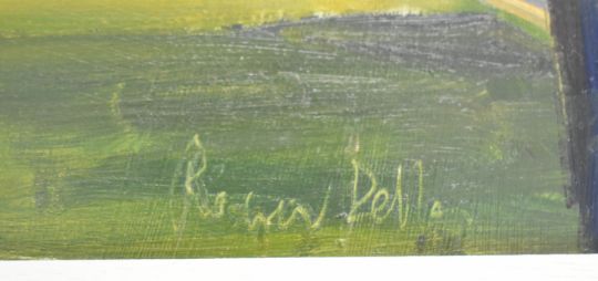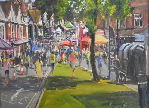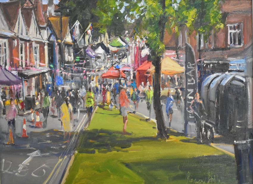 Roger Dellar (born 1949) oil on canvas village celebration street party scene, signed lower right, 29.5 x 39.5cm, in white painted frame