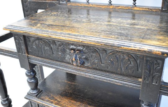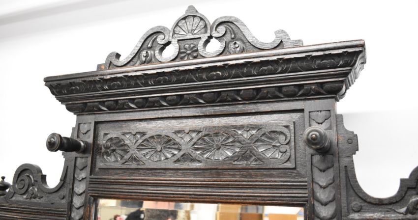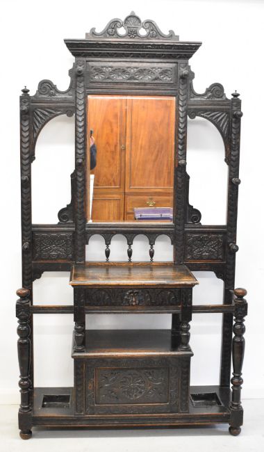 19thC carved oak mirror backed hall stand, W122 x D42 x H230cm