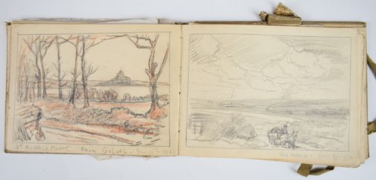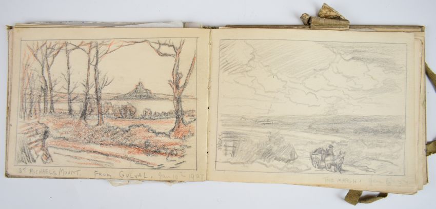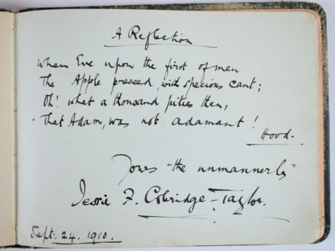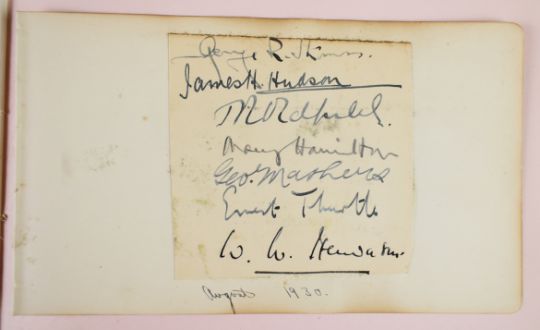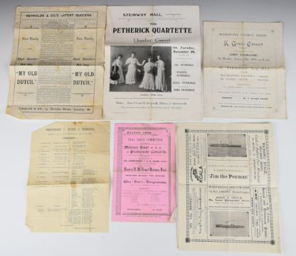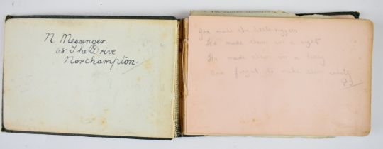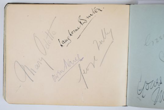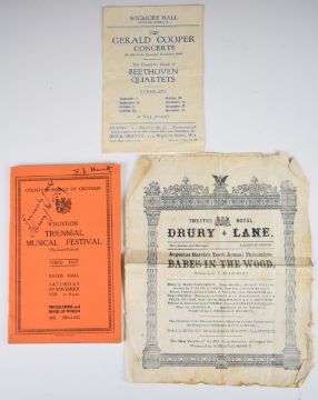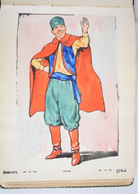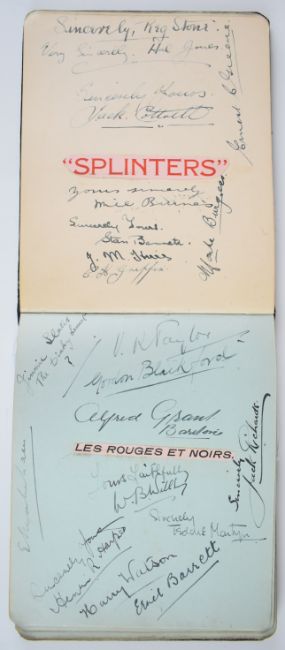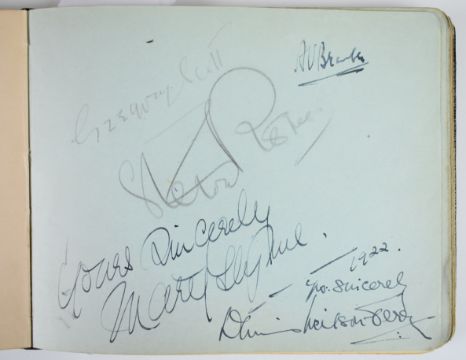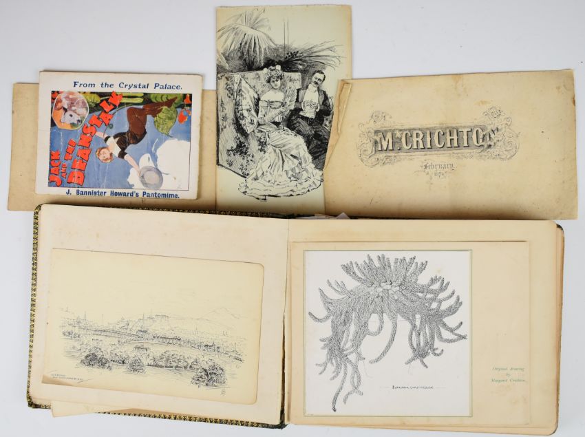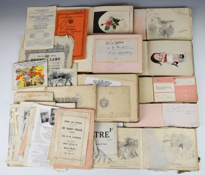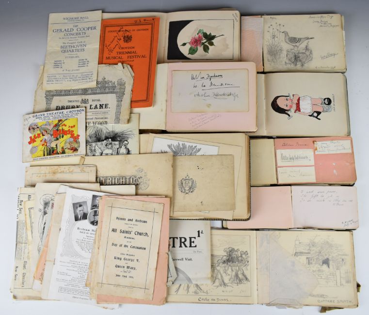 Group of vintage autograph albums containing cuttings, verse and quotes, watercolours, ink and pencil sketches including signatures of Mary Odette (actress), Bertha Willmott (actress), Eustance Percy, Owen Seaman, Bennet Burleigh (scottish born pirate), Hugh Dalton (Bishop of Auckland), Ramsay Macdonald, Arthur Henderson, Charles W. Barnett, John Bland-Sutton (surgeon), Hugh Candy (chemist), Arthur Dendy (zoologist), numerous autographs from the musical comedy ‘Splinters’ with Reg Stone and Hal Jones, others from Les Rouges Et Noirs including Gordon Blackford, Jack Cottrell, Vivien Taylor and Ernest Greene. Programme from the Croydon Trennial Musical Festival 1928 signed by Henry Wood and with an accompanying signed letter. Album belonging to Mary Muir Crichton with wood engravings by Alexander Pender Crichton 1926, watercolour of Rugby Players ‘Modern Art’ illustration, pencil portrait of Byron, drawing by Margaret Crichton, bookplate and other artwork. Artist's sketchbook (1920s) with scenes from Nancledra, Gulval and Ludgvan Cornwall. Collection of theatre and musical programmes including a performance of Babes in The Wood Drury Lane, The Petherick Quartette at Steinway Hall, A Marriage of Convenience at St. Leonards Pier, Albert Chevalier’s Recitals Croydon 1894, concert programme 1898 at The Institute Hythe etc