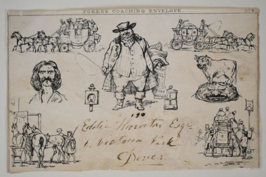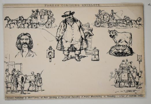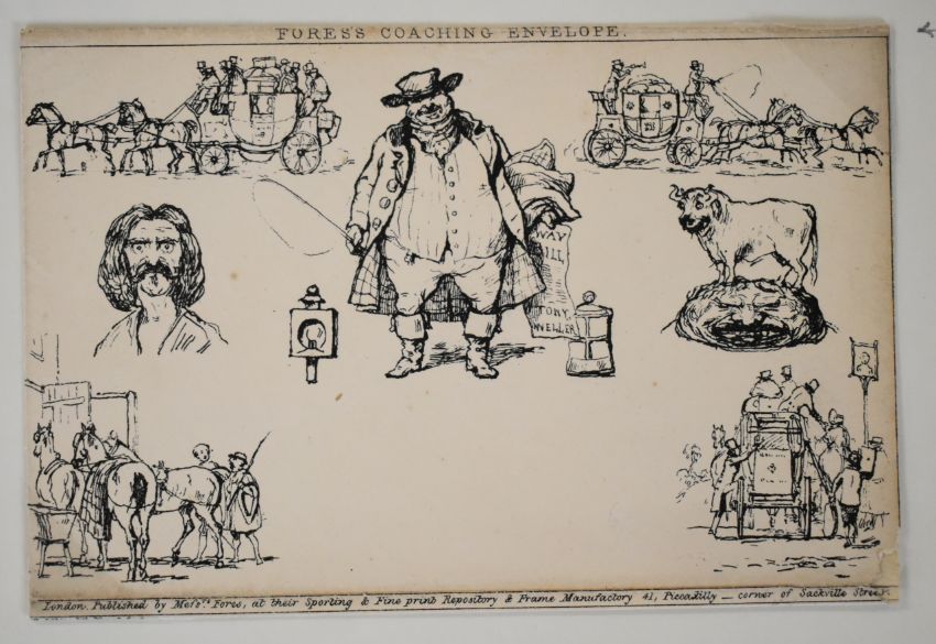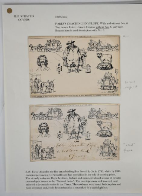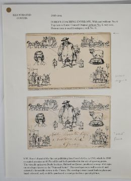 Fores coaching envelopes, two Fores coaching caricature envelopes, one unused complete and one used front only, written up on album page