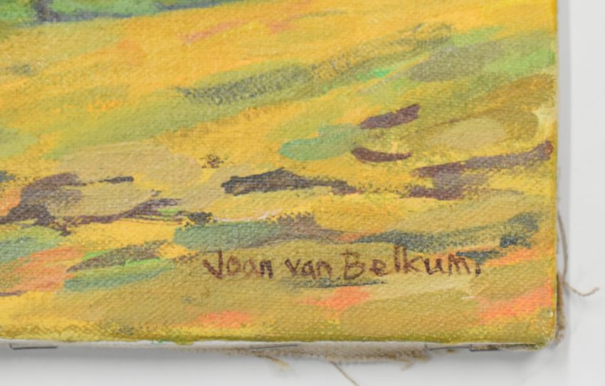 Joan Van Belkum (1928-2014) oil on canvas hilltop view at Frocester, extensive Gloucestershire landscape, signed lower right, 46 x 61cm, titled verso