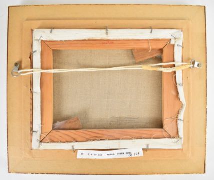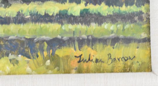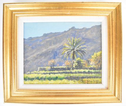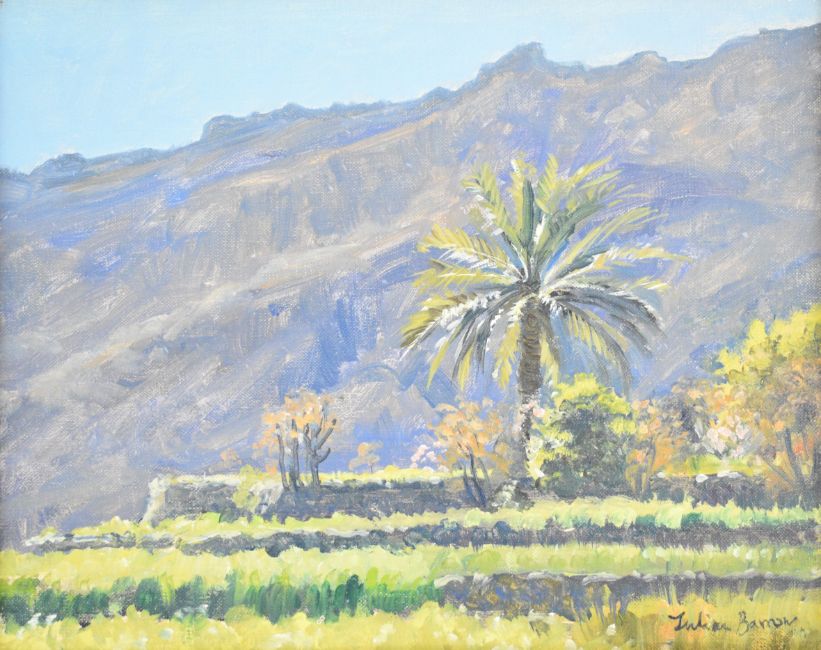 Julian Barrow (1939-2013) oil on canvas Watan, Gubra Bowl, Oman landscape with palm tree and hills rising beyond, signed lower right 19.5 x 24.5cm, in gilt frame with title verso