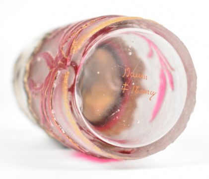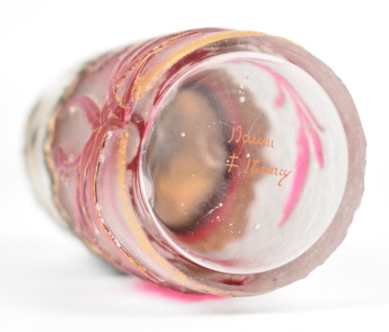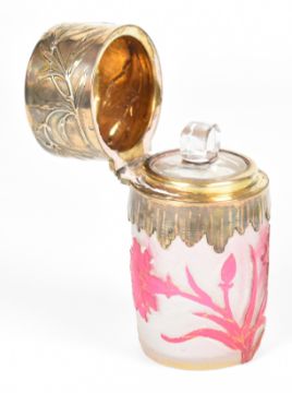 Daum, Nancy silver mounted cameo glass perfume / scent bottle decorated with carnations, with stopper, gilt script to base 'Daum Nancy' and handwritten transcript from a 1969 Sotheby's catalogue entry when the current vendors acquired it, H12cm