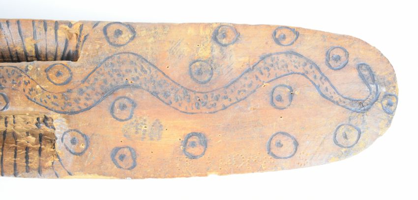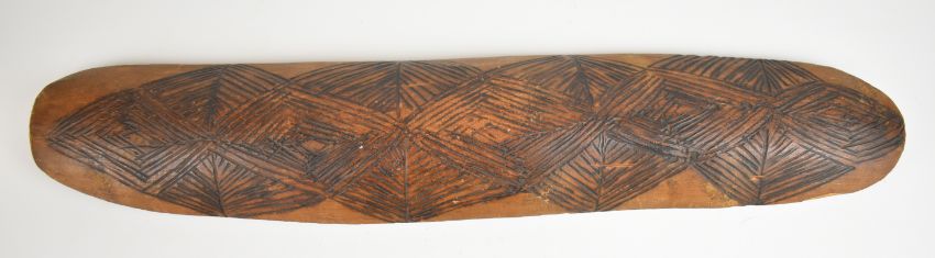 Aboriginal carved wood shield with inset grip verso, length 44cm