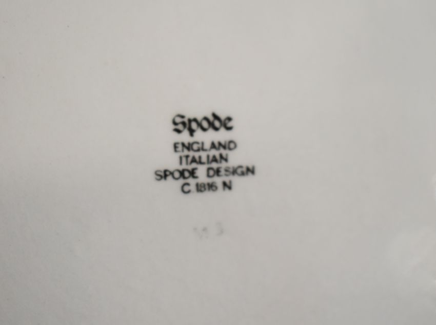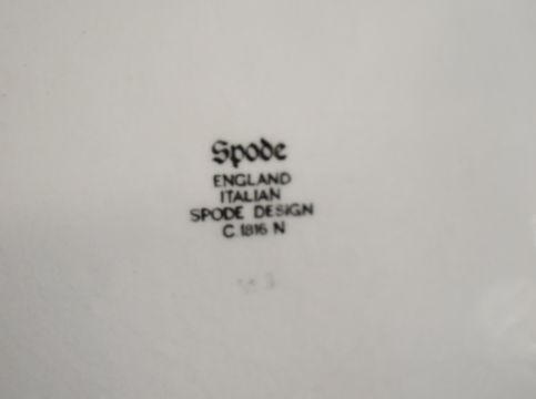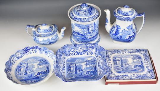 Collection of Spode dinner and tea ware decorated in the Blue Italian and Venetian patterns to include a giant teapot, coffee pot, biscuit barrel and lid, candlestick, bowls, jugs, dishes, six small lidded pots, toast rack, butter dish etc., and including an Edwardian childhood design plate, approximately 35 pieces, tallest 32cm