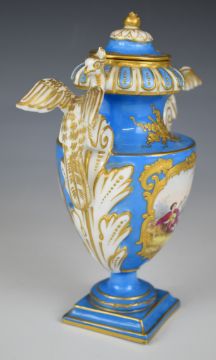 19thC Sèvres or similar pedestal covered vase with figural griffin handles and decorated with Watteau scenes, signed 'Max', with blue Sèvres mark to base, H19cm