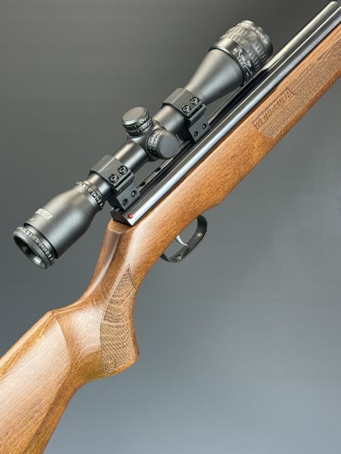 Weihrauch HW57 .22 under-lever air rifle with chequered semi-pistol grip and forend, raised cheek piece and adjustable trigger and Hawke Sport HD 4x32 AO scope, serial number 2017685.