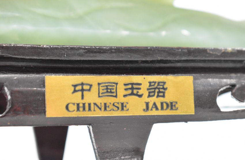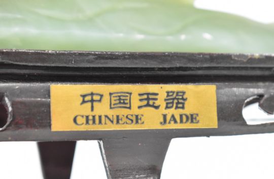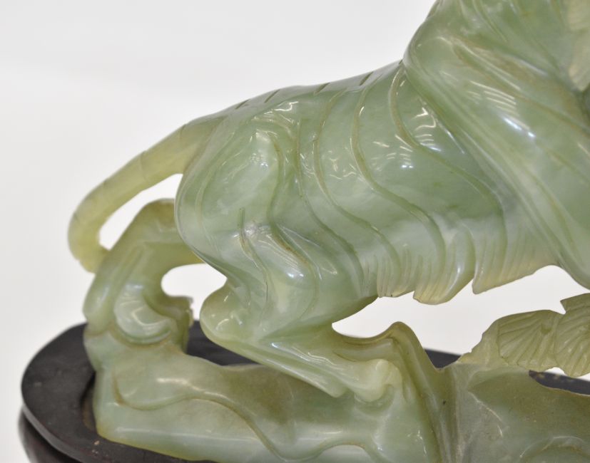 Chinese carved jadeite or similar leaping lion figure, on stand bearing 'Chinese Jade' plaque, H20cm