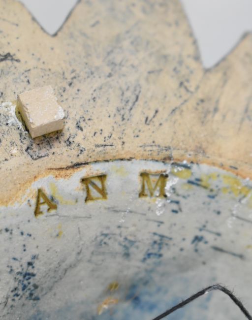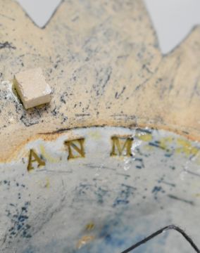 Richard Goodwin Jones framed ceramic and driftwood collage, Ned Heywood and Ewenny Pottery dishes and a facemask initialled ANM Bath, etc, largest diameter 26cm