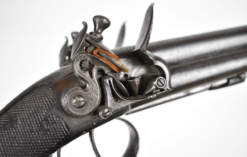 William Smith of London 80 bore flintlock quadruple barrelled volley pistol with engraved hammers, trigger guard and underside, chequered grip, vacant wrist cartouche, double trigger and 4 inch barrels, overall length 21.5cm.