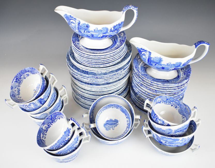 Collection of Spode dinner and tea ware decorated in the Blue Italian pattern, to include platters, sauce boats, jugs, soup bowls, egg cups, variously sized plates, cups etc, approximately 125  pieces, tallest 11cm