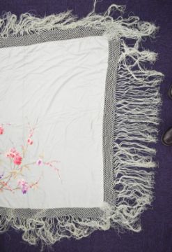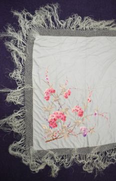 19th/20thC Chinese embroidered piano shawl with prunus blossom decoration on a mint green ground, 150 x 150cm