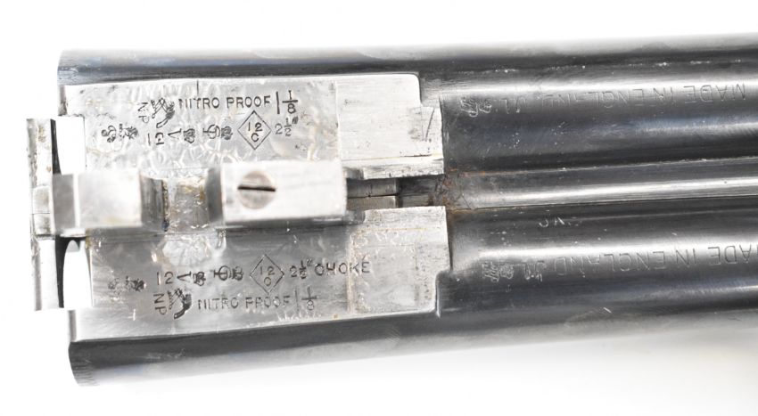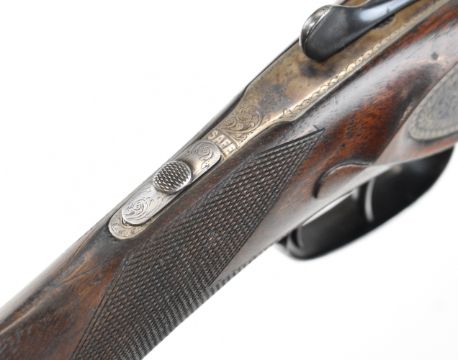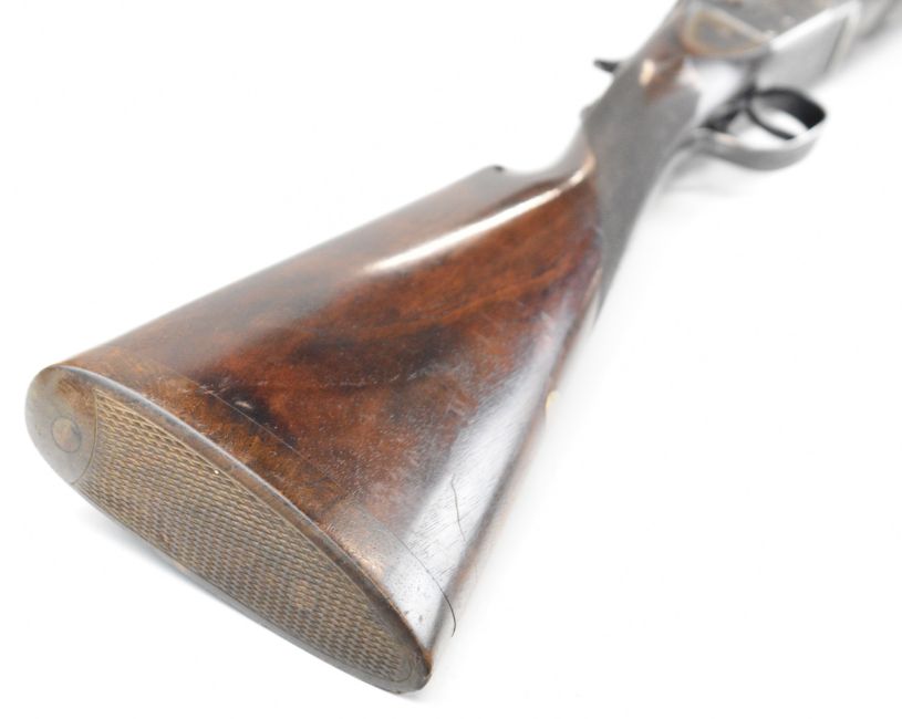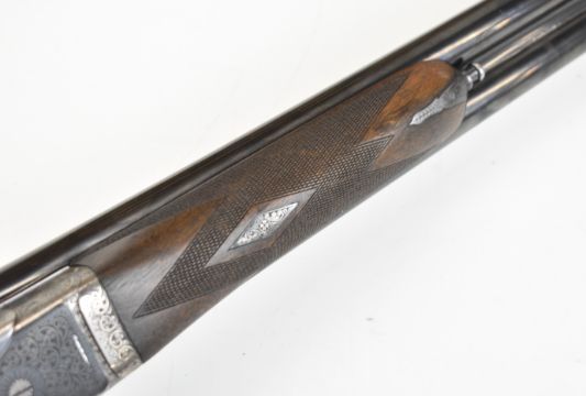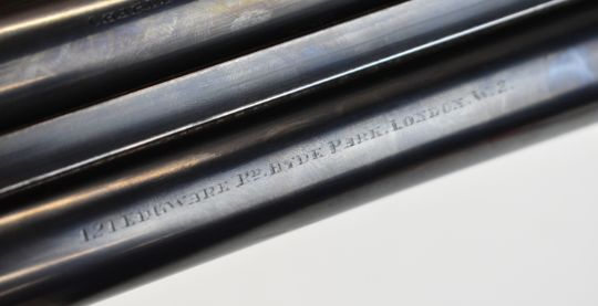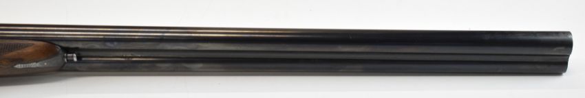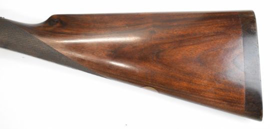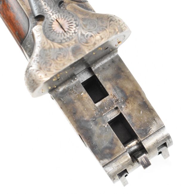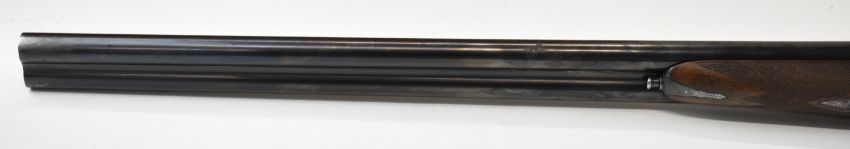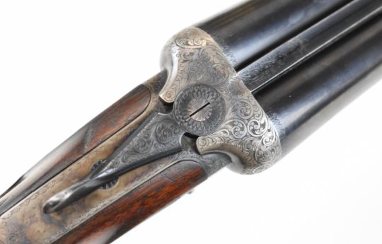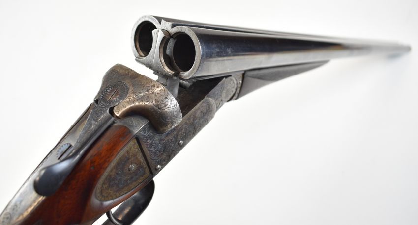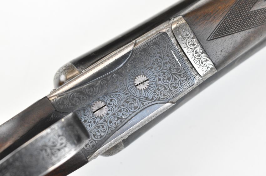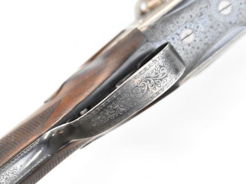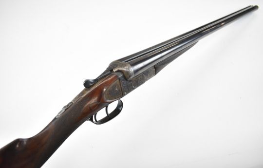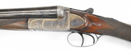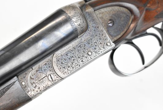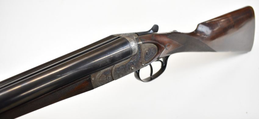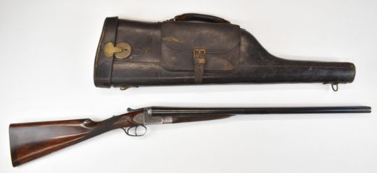 Charles Hellis & Sons 12 bore side by side ejector shotgun with engraved sidelock plates, underside, trigger guard, top plate, thumb lever and fences, chequered grip and forend, carved teardrop to the wrist, vacant cartouche to the underside of the stock, double trigger and named 26 inch barrels choked improved cylinder and ¾, overall length 110cm, length of pull 38.5cm, serial number 5256, in leather leg of mutton gun carry case. PLEASE NOTE THAT A VALID RELEVANT SHOTGUN CERTIFICATE IS REQUIRED TO VIEW OR PURCHASE THIS LOT AND FOR ALL SHOTGUNS OR RIFLES PLEASE ENSURE YOU HAVE THE RELEVANT CERTIFICATE BEFORE BIDDING.