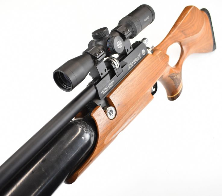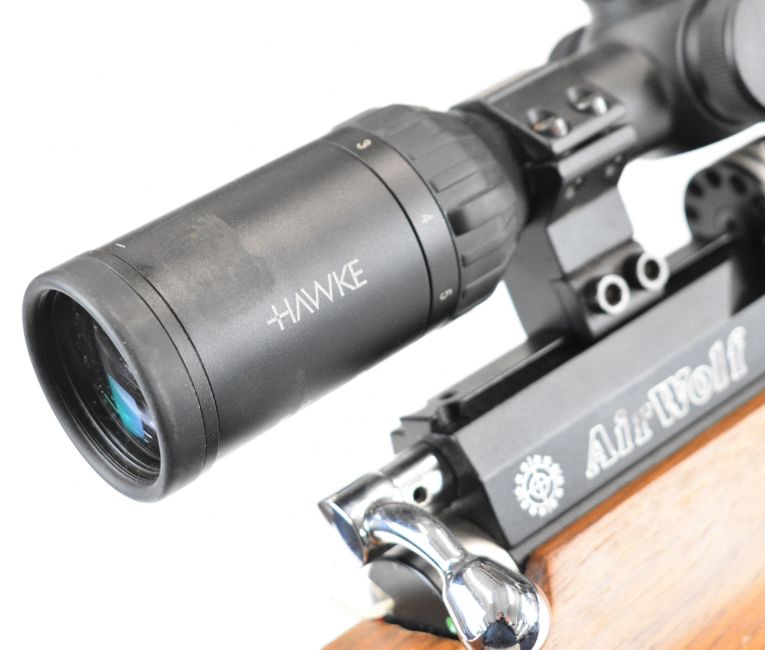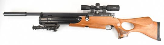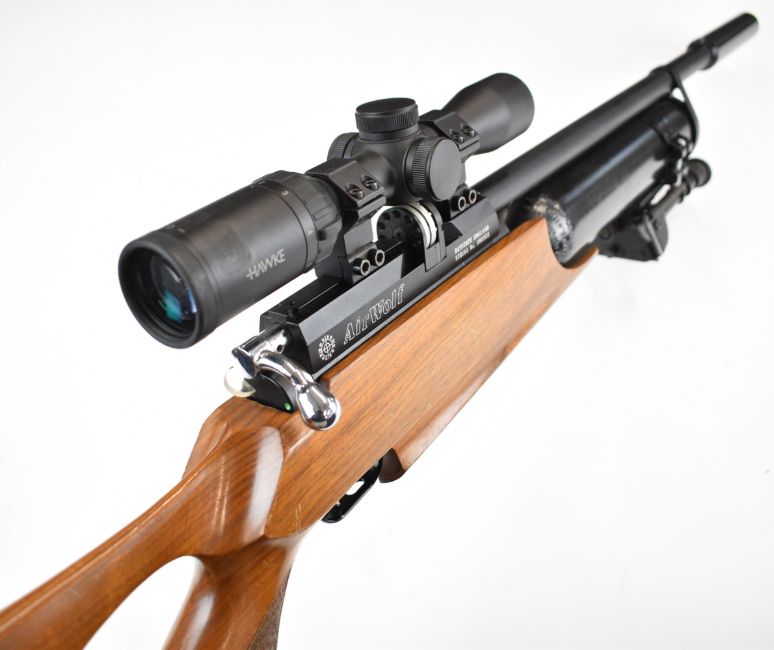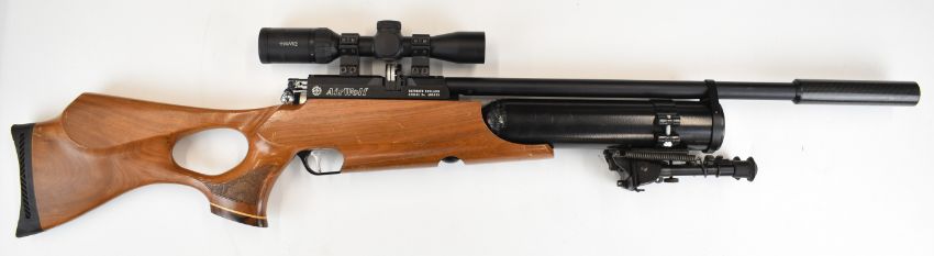 Daystate Air Wolf .22 PCP FAC air rifle with textured thumb-hole grip, raised cheek piece, 10-shot magazine, bi-pod, Hawke Panorama 2-7x32 scope and sound moderator, serial number AW0955. PLEASE NOTE THAT A VALID RELEVANT FIREARMS CERTIFICATE IS REQUIRED TO VIEW OR PURCHASE THIS LOT AND FOR ALL SHOTGUNS OR RIFLES PLEASE ENSURE YOU HAVE THE RELEVANT CERTIFICATE BEFORE BIDDING.
