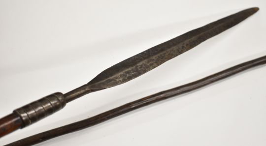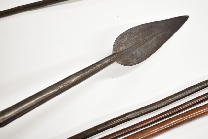 Five mainly 19thC tribal spears, all with wooden shafts and metal tips, some weighted, largest 193cm long. PLEASE NOTE: WE ARE NOT ABLE TO OFFER OUR USUAL POSTAGE SERVICE FOR THIS LOT