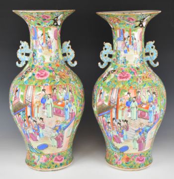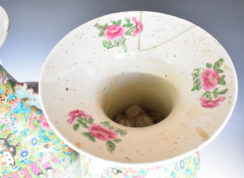 Pair of 19thC famille rose twin handled floor vases decorated with court scenes, butterflies, flora and fauna, H57cm