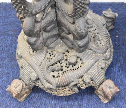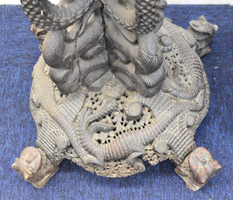 19thC pair of Anglo Indian carved jardiniere stands with dragon, snake and bird decoration, H94cm