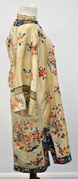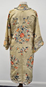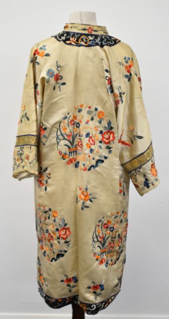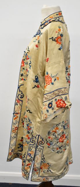 Two early 20thC Chinese cream silk tunics / coats embroidered with floral decoration, the largest W124 x L106cm