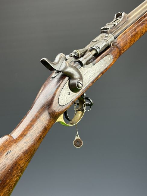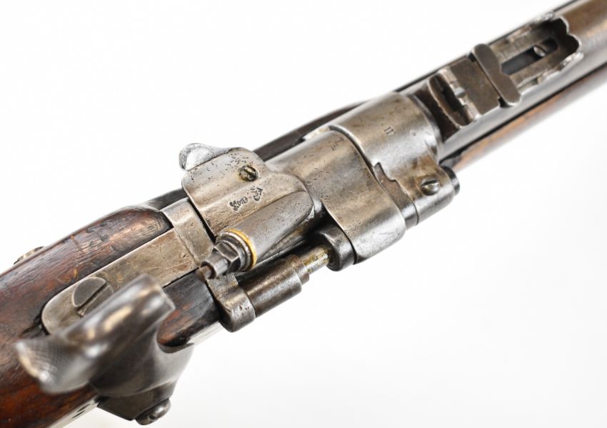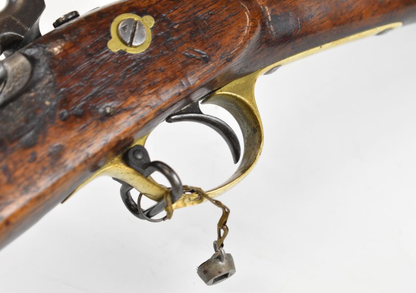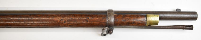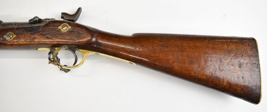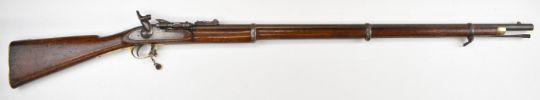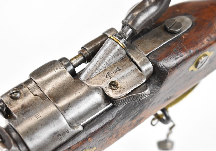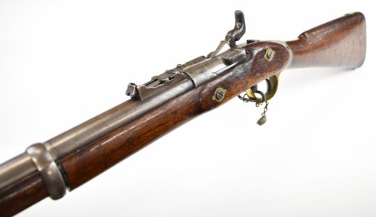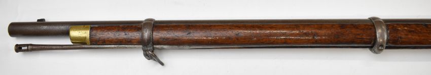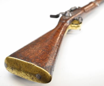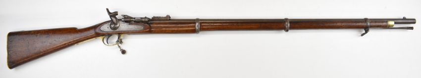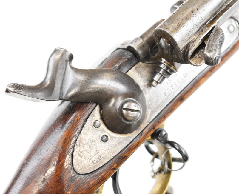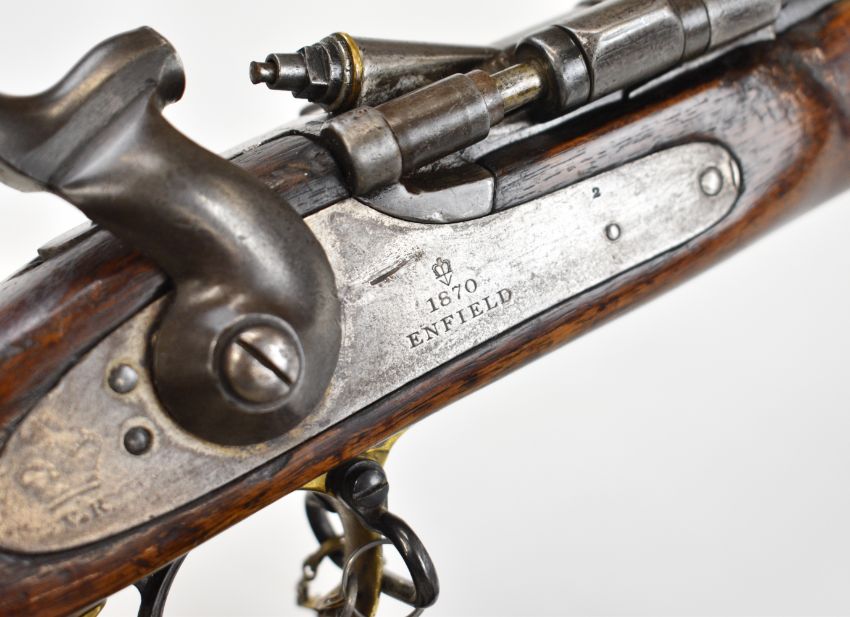 Enfield 3-band percussion hammer action Snider rifle with lock stamped '1870 Enfield' and with crown over 'VR' cypher, brass trigger guard, butt plate and mounts, adjustable ladder sights and 36.5 inch rifled barrel, overall length 137.5cm.