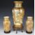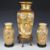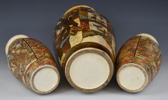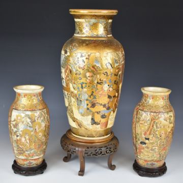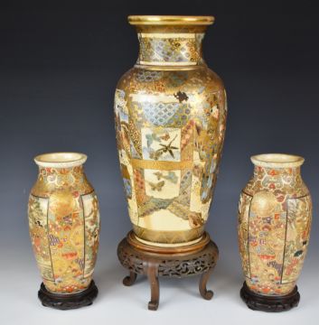 19th/20thC Japanese garniture of three Satsuma vases with figural Samurai decoration, raised on carved wooden stands
