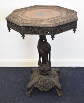 19thC Anglo Indian carved octagonal table with figural animal decoration and supports, diameter 63 x H80cm