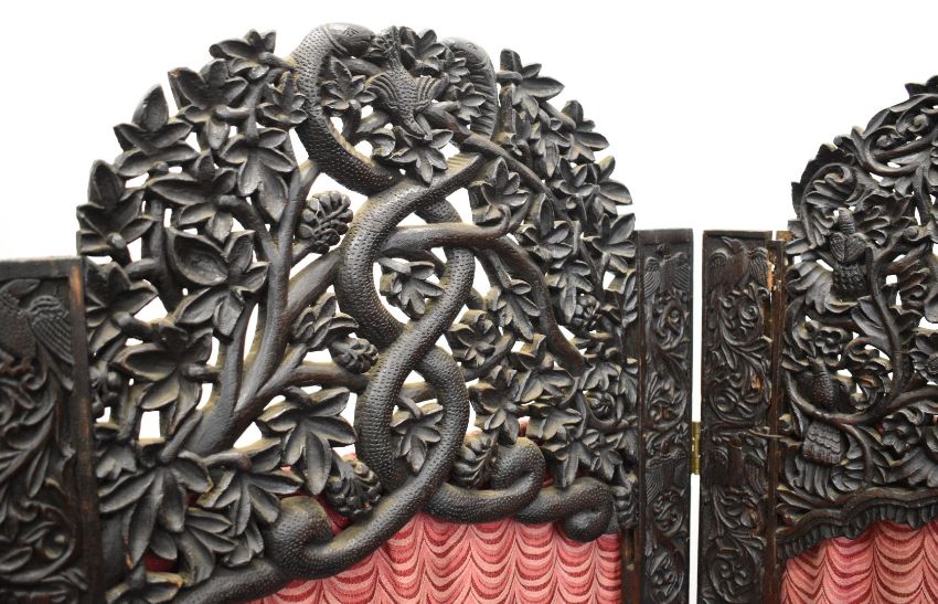19thC Anglo Indian carved four division screen decorated with snakes, deities, flora and fauna, W240 x H54cm