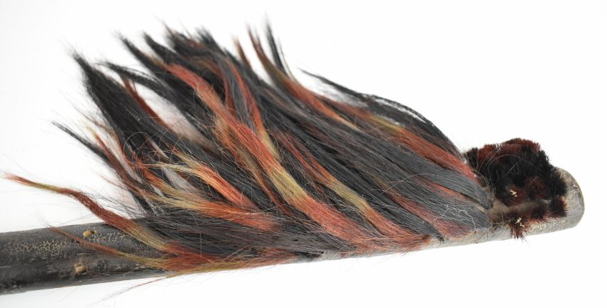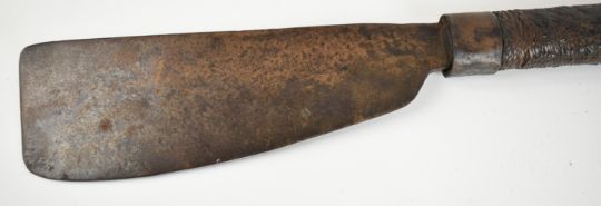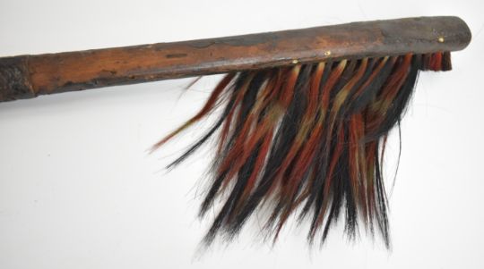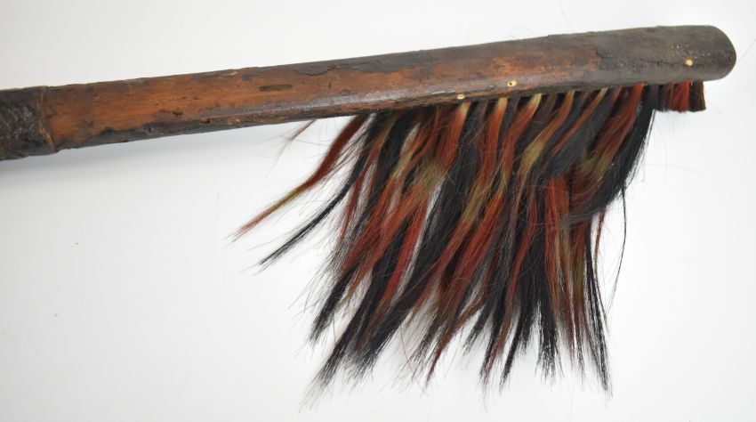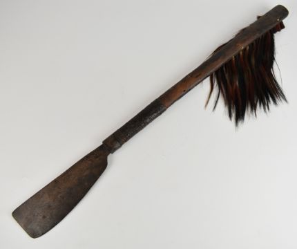 19thC Borneo tribal head hunter's axe with hair finial, length 80cm. PLEASE NOTE: WE ARE NOT ABLE TO OFFER OUR USUAL POSTAGE SERVICE FOR THIS LOT