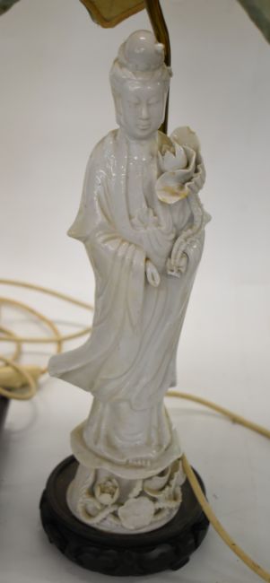 Three Chinese blanc de chine figural Guanyin lamps with lotus leaf shades, tallest 96cm with shade