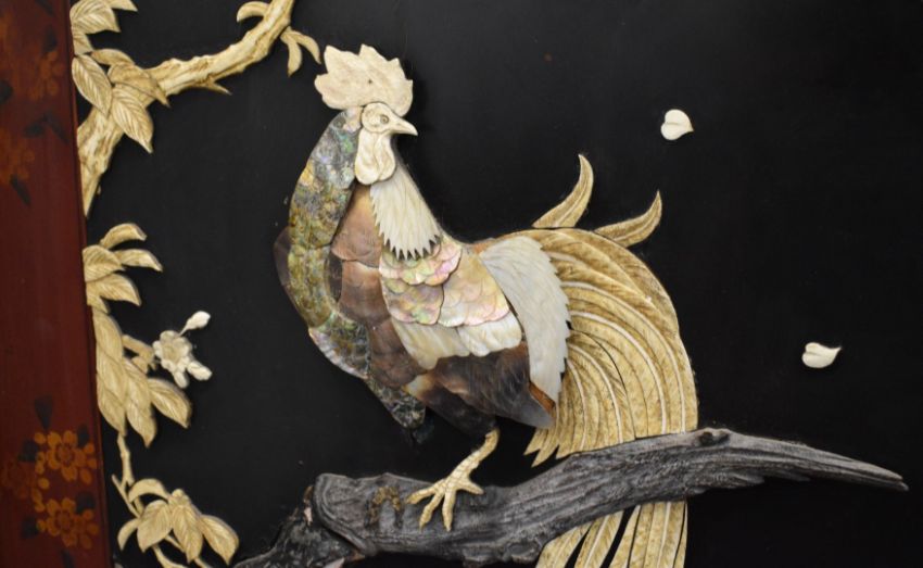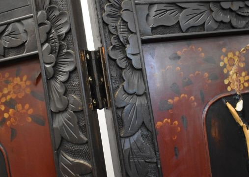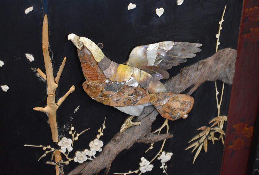 19th/20thC Japanese shibayama two division screen with carved, mother of pearl and lacquer decoration, W160 x H186cm
