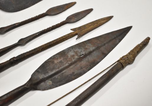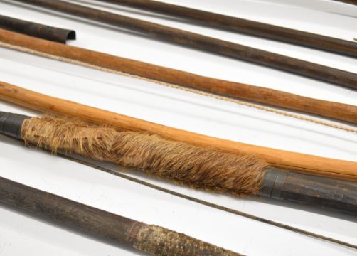 Nine tribal bows / short spears, mainly African, longest 144cm. PLEASE NOTE: WE ARE NOT ABLE TO OFFER OUR USUAL POSTAGE SERVICE FOR THIS LOT