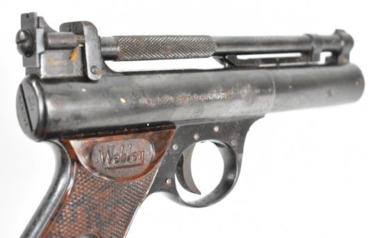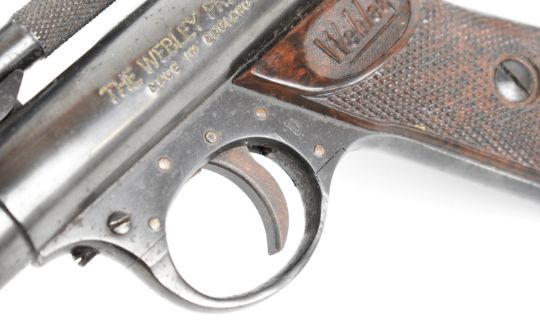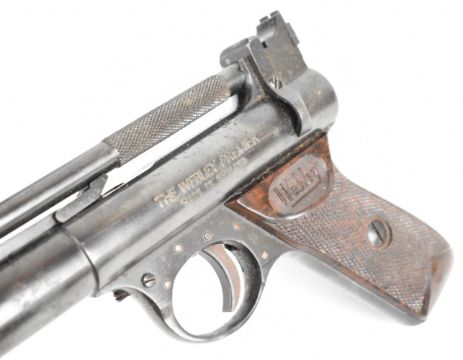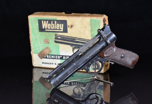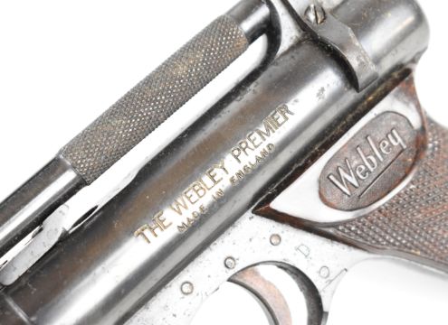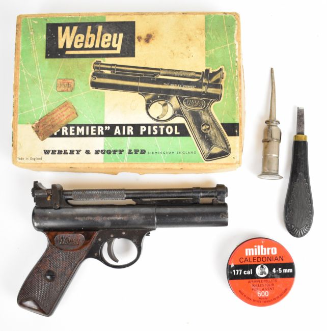 Webley Premier .177 air pistol with named and chequered Bakelite grips and adjustable sights, serial number 2430, in original box with oil bottle and turnscrew. PLEASE NOTE: ALL POST - 1939 AIR GUNS CAN ONLY BE SHIPPED TO AN RFD AND NOT TO A HOME ADDRESS.