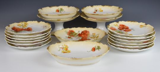 Limoges dinner and teaware decorated in orange and yellow floral pattern with scalloped rim, eighteen pieces including a pair of tazzas, plates and dishes largest 26cm