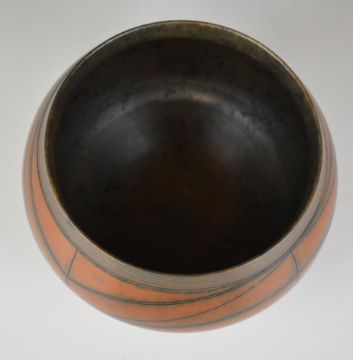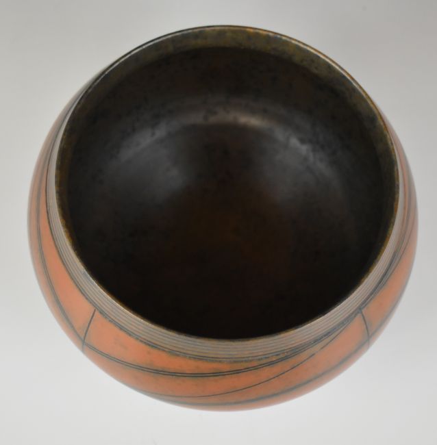 Duncan Ross (b1943) studio pottery bowl with burnished orange glaze and geometric decoration, diameter 19 x height 13cm