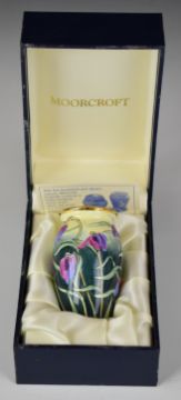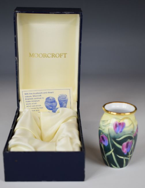 Moorcroft enamels vase decorated with fritillarias, with box, H6.5cm