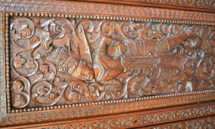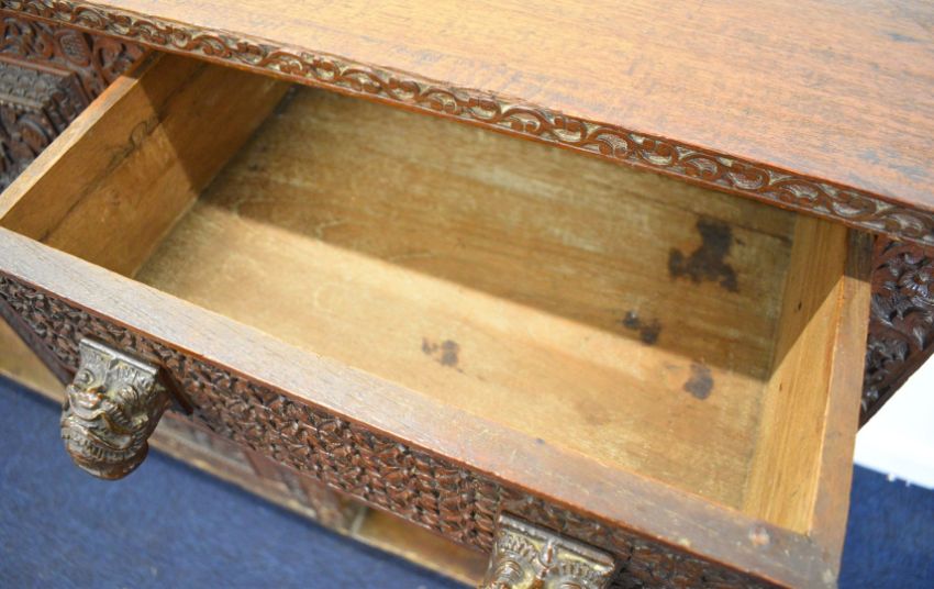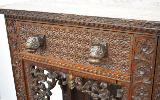 Anglo Indian carved cabinet with central cupboard and two drawers, W160 x D45 x H110cm