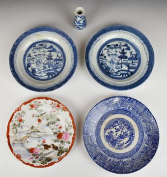 19th/20thC Chinese and Japanese export plates and a small vase, largest diameter 23cm