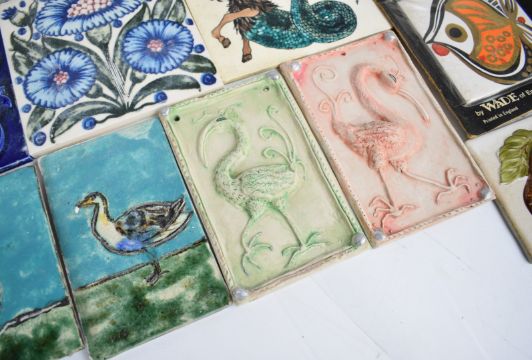 Collection of mid century modern to contemporary tiles, including point of sale advertising set of six mid century modern Wade tiles designed by Rhys and Jean Powell, studio pottery examples by Teressa Chrichton etc, largest 15.5 x 15.5cm